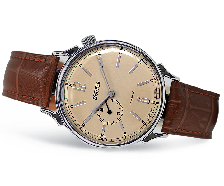 Vostok 58157G với thiết kế vô cùng lịch lãm và đậm nét cổ điển. Mặt số màu vàng nâu nổi bật. Bộ máy cơ Vostok 2403 lên cót tay với 17 chân kính. Kích thước: 38×45,2×11 mm.