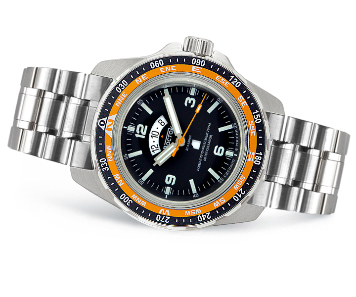 Thiết kế bắt mắt, đậm chất hiện đại. Máy cơ Vostok 2432.01 tự động với 32 chân kính. Kháng nước 200M.
